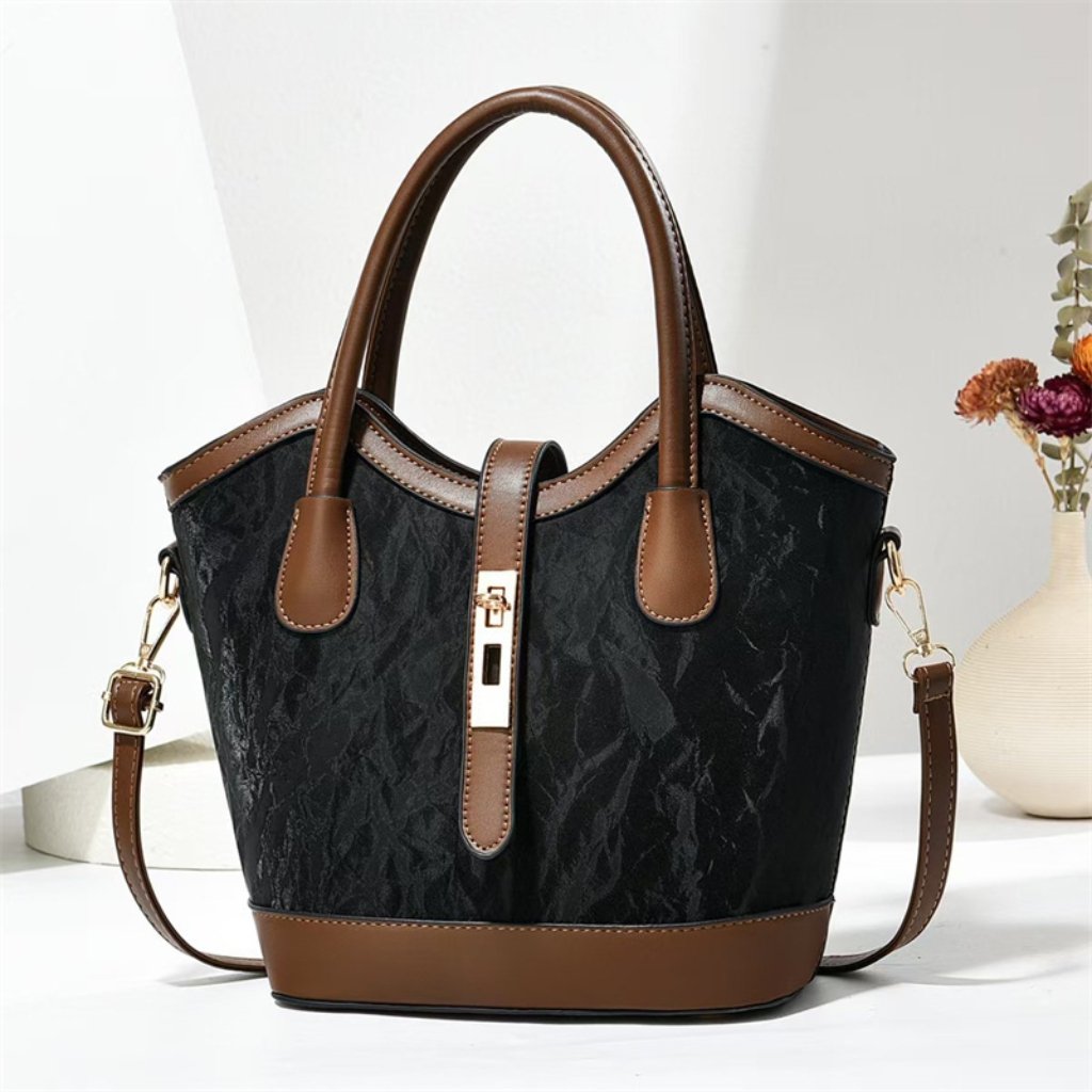 Elevate your everyday style with this chic and versatile bucket tote. This bag stands out with its unique two-tone design, combining a textured, crinkle-effect body with smooth, contrasting trim and handles. The stylish, structured shape and elegant metal hardware make it a sophisticated accessory for any outfit.