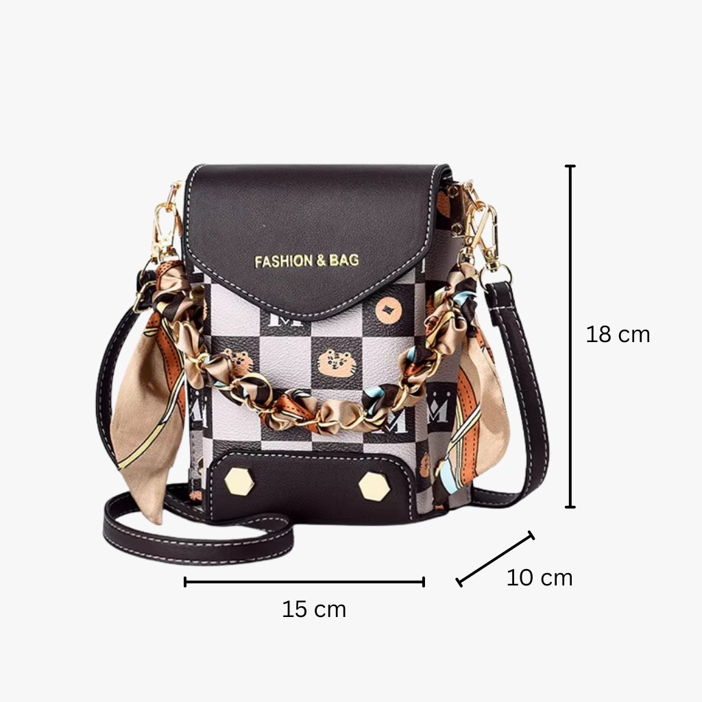 Playful Checkerboard Mini Phone Bag – Scarf & Chain Crossbody