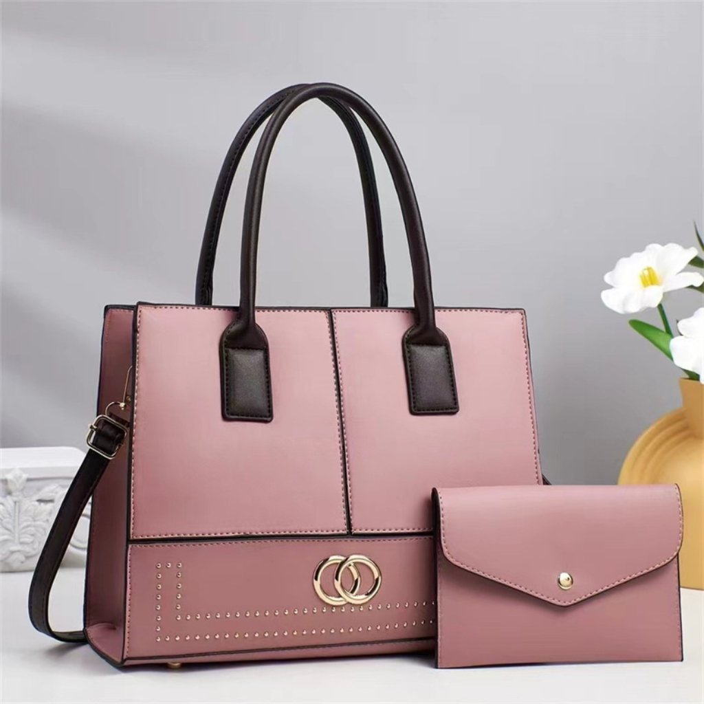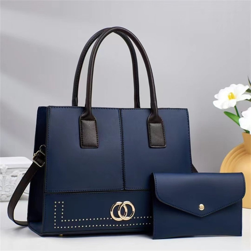 Add elegance and functionality to your wardrobe with this PU leather tote handbag set, designed for the modern woman. The set includes a spacious tote handbag and a matching clutch purse, making it perfect for both daily use and special occasions. The handbag features a sleek structured design, dual top handles, a detachable shoulder strap, and a spacious interior with multiple compartments, ensuring all your essentials stay organized. The set is finished with a chic metal ring detail for a premium look.