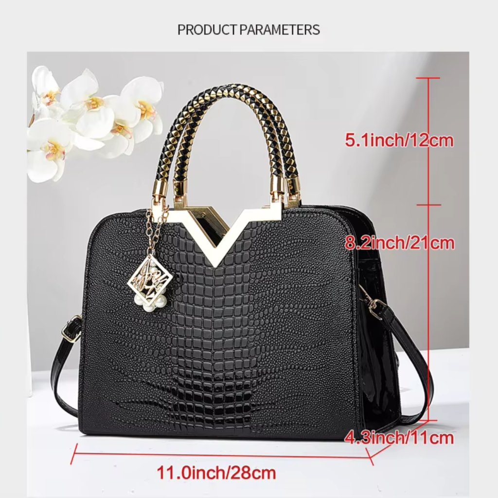 Luxury Glossy Croc-Texture PU Leather Handbag with Shoulder Strap for Women