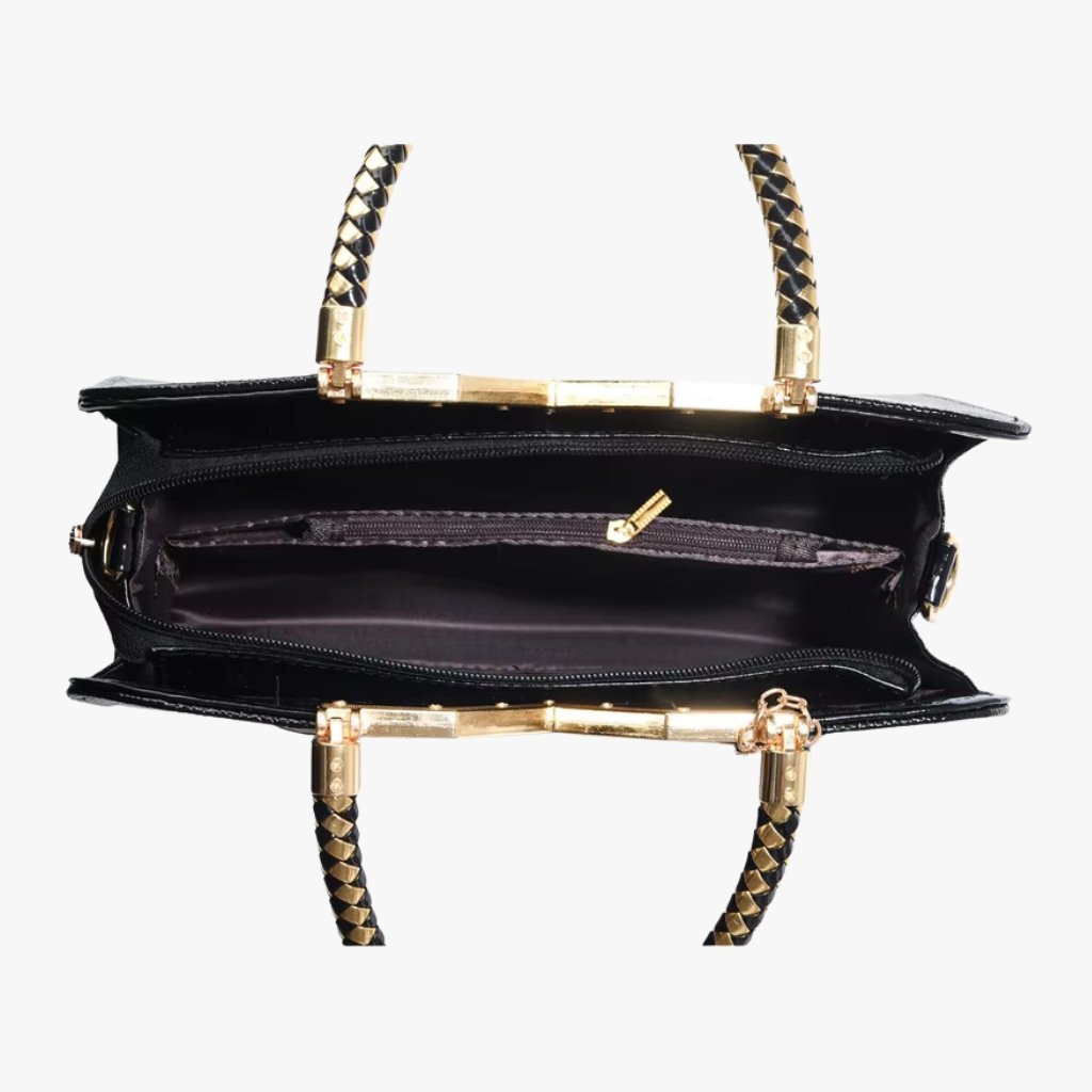 Jeweled Handle: The dual top handles feature a unique braided design accented with gold metal studs, adding a sparkling, ornate touch that is comfortable to grip.