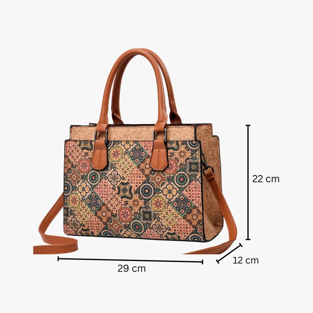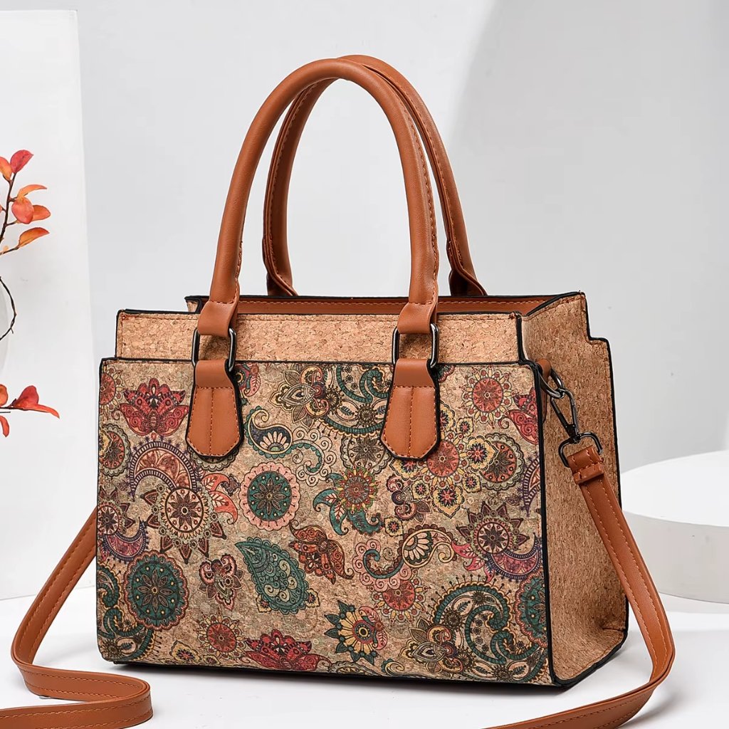 Unique Texture: The side panels and edges appear to feature a natural, cork-like texture (paired with PU material as listed), providing an earthy contrast to the vivid pattern.