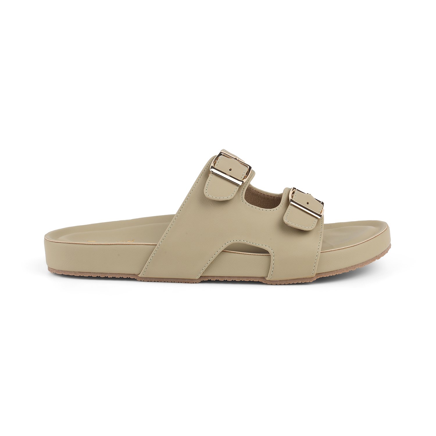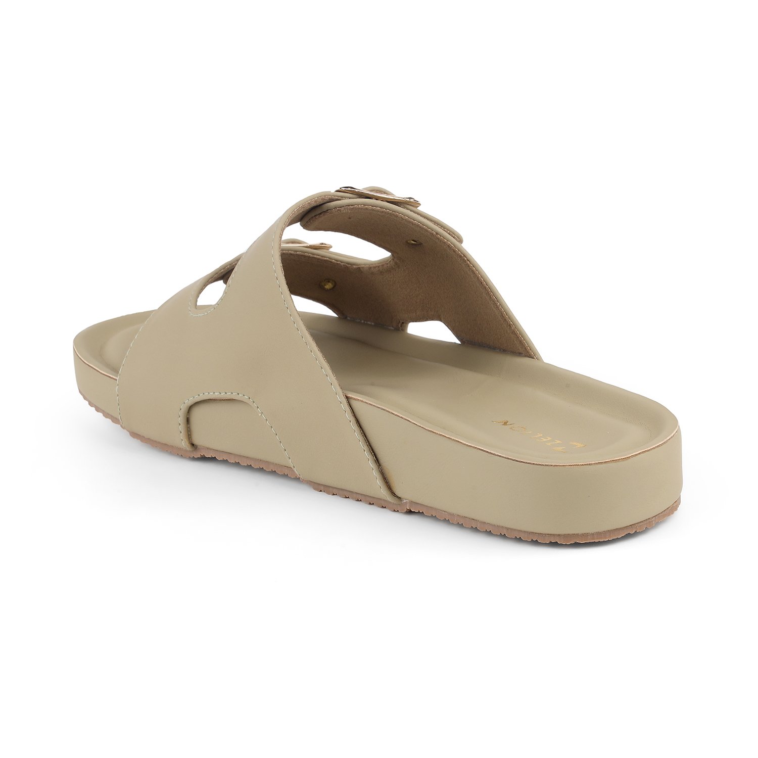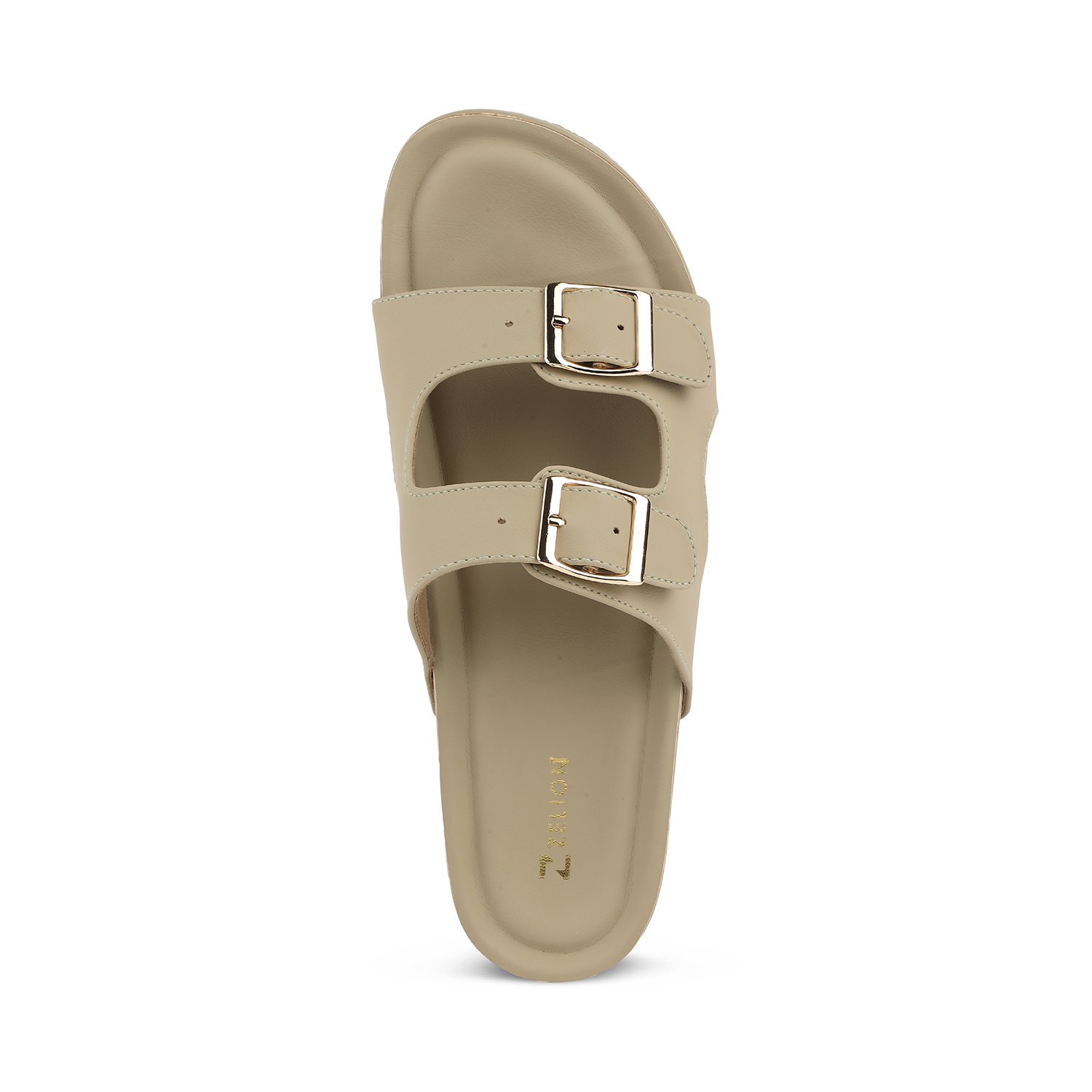 Zelion Women’s Classic Double-Buckle Comfort Slides – Beige & Black