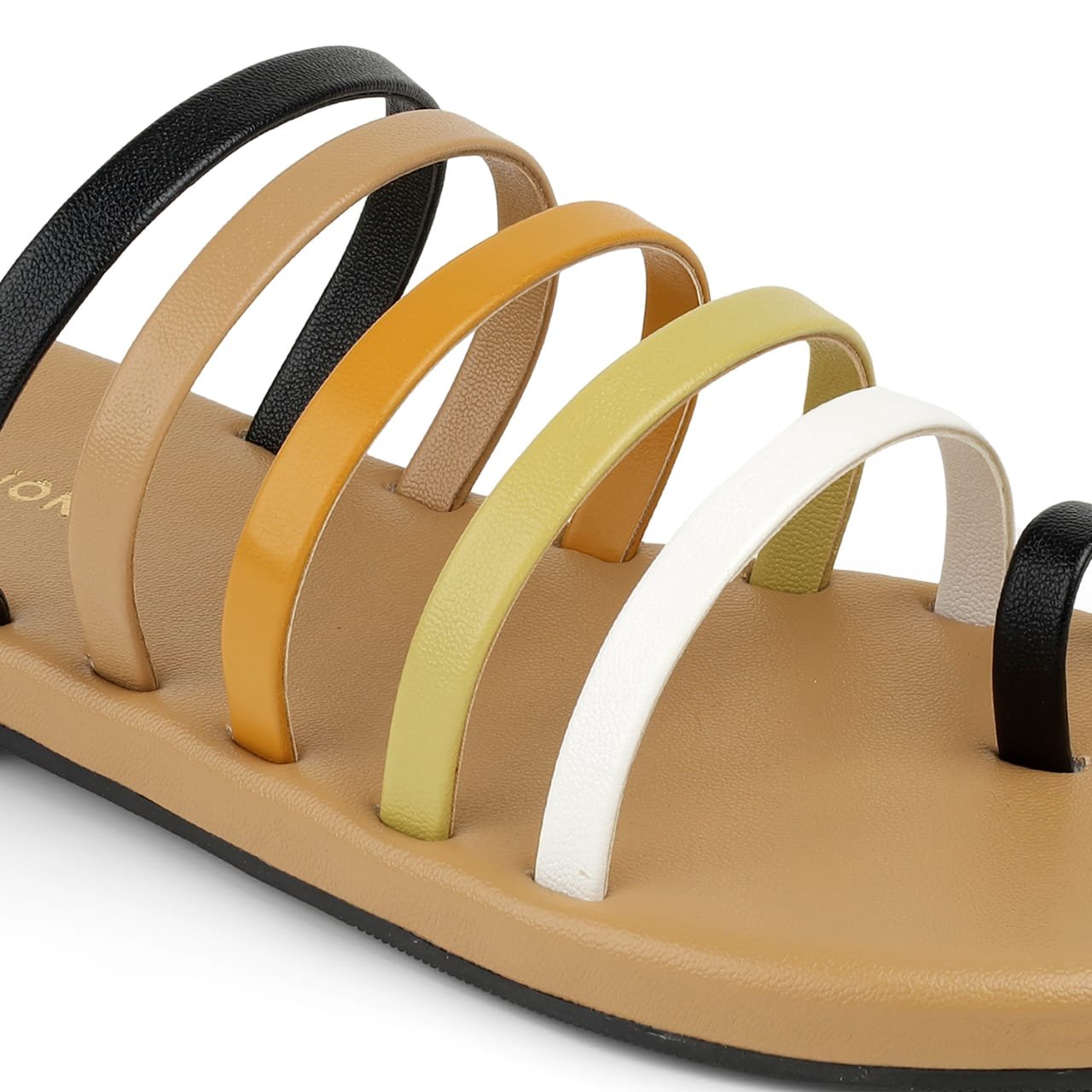 This stylish footwear features a chic multi-strap design with metallic accents, perfect for adding a touch of elegance to any casual or festive ensemble. The minimalist toe-loop silhouette ensures a secure fit while maintaining a modern, airy feel.