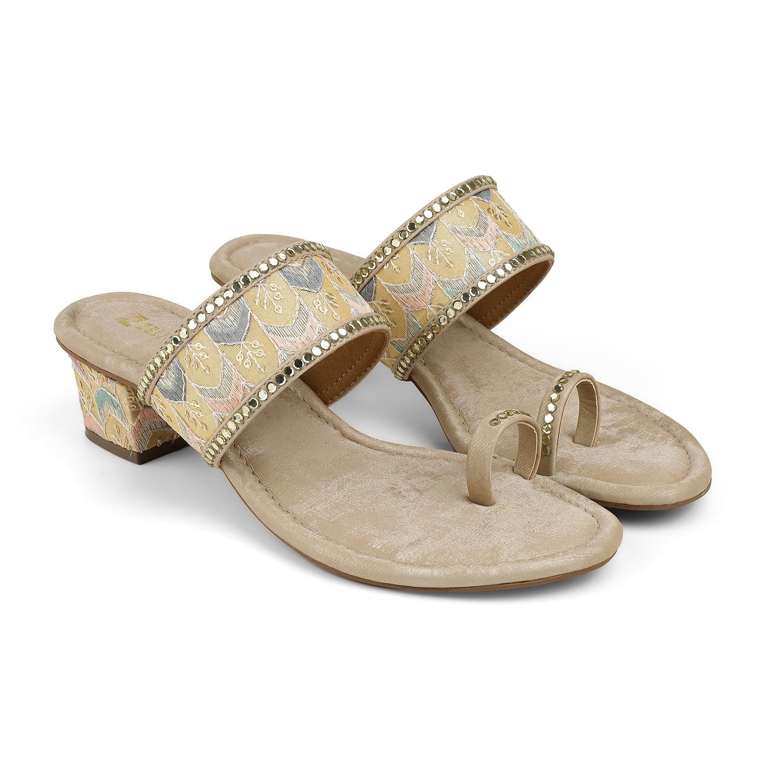 Zelion | Women’s Golden Embroidered Ethnic Block Heel Slip-On Sandal